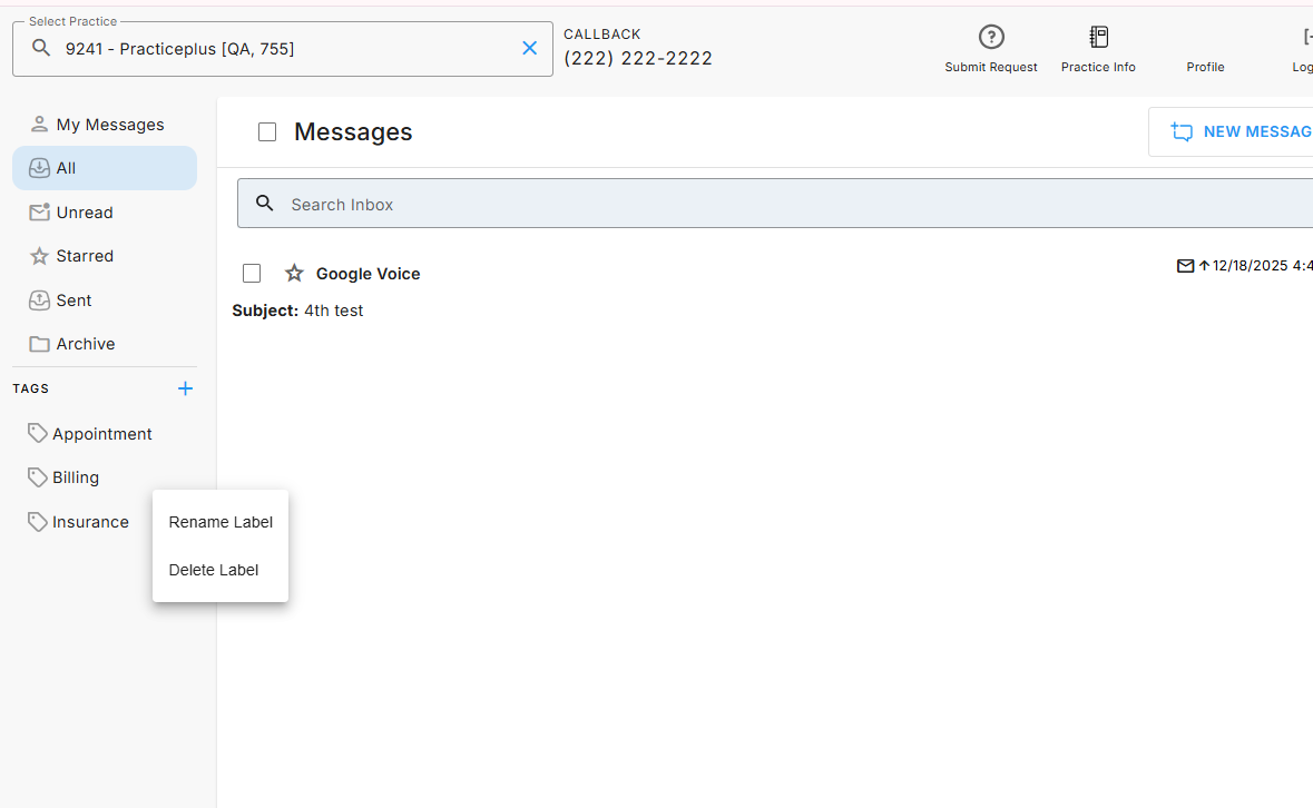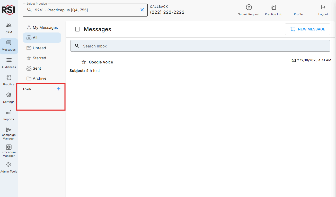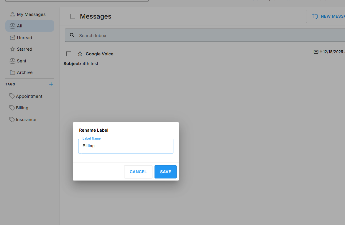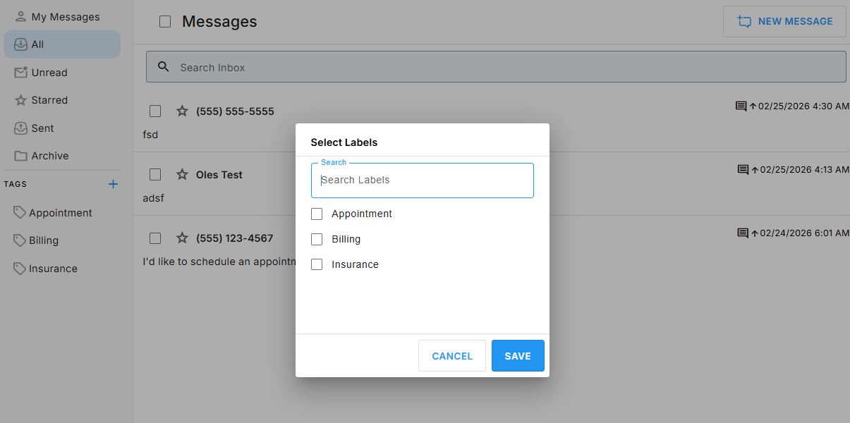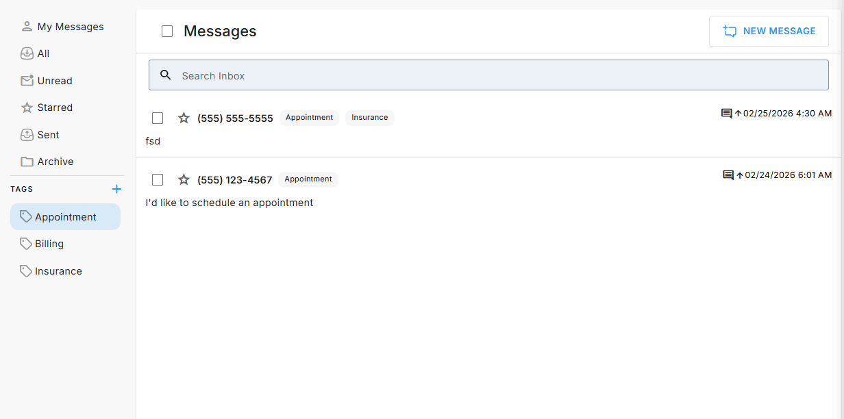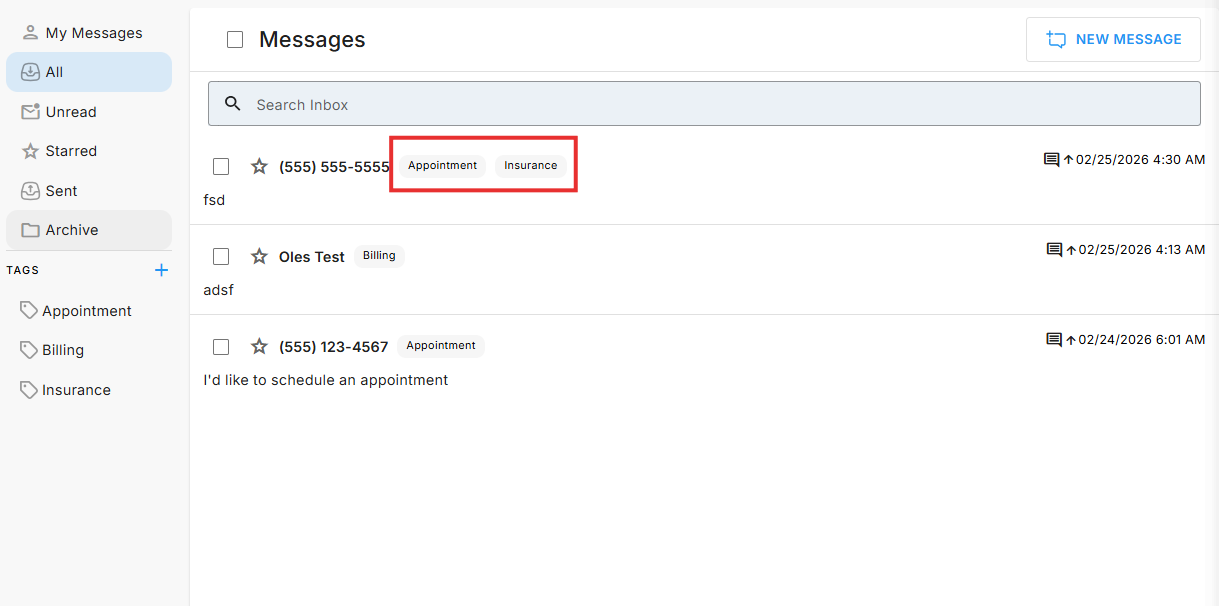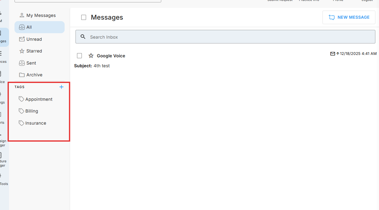Message Tags (also called Labels) let you organize your patient conversations in the Messages inbox — similar to folders, but more flexible. A single conversation can have multiple tags at the same time, making it easy to filter and find messages by topic or workflow.