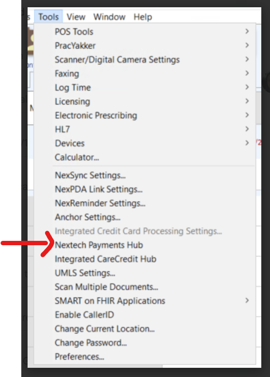- Navigate to: Tools > Nextech Payments Hub > Setup