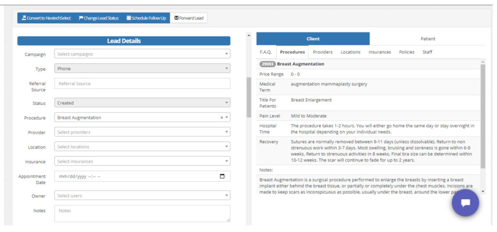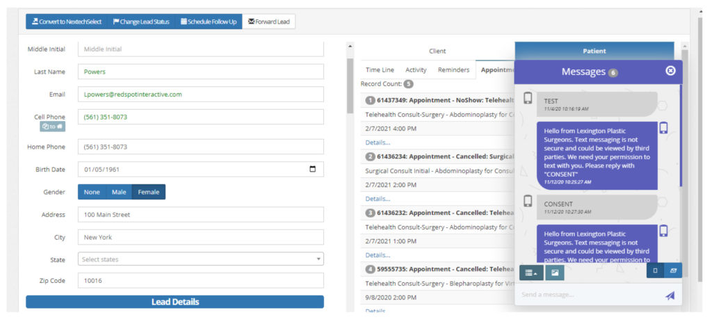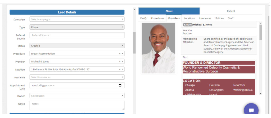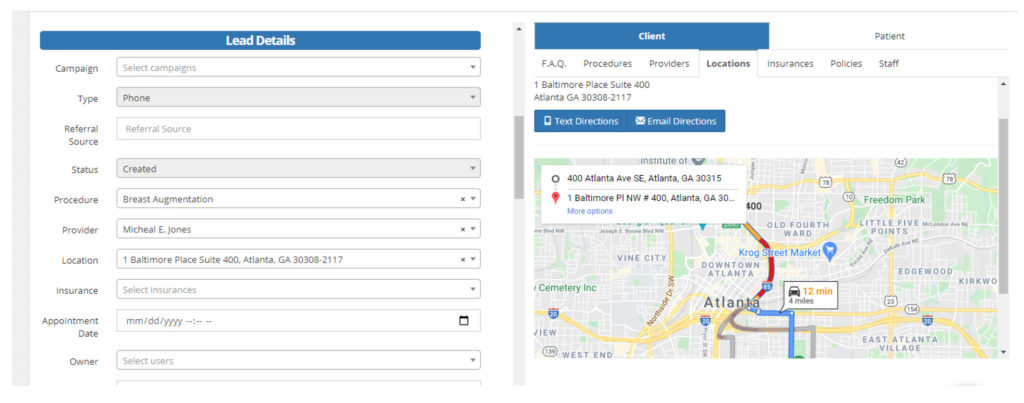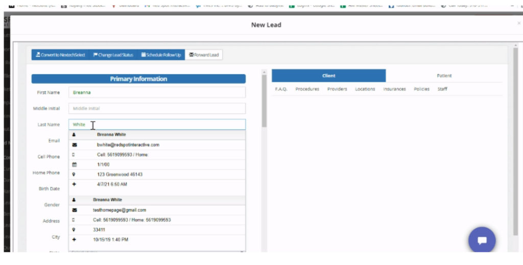 - As you begin typing, the system will look for the name as a lead or a patient. If their information is stored, it will auto populate. If not, continue typing.
